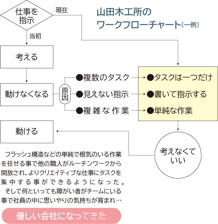 当初は難しさも感じていた障がい者雇用だが、「その人の特性に合った仕事」と「難しい仕事」を丁寧に仕分ける事で、むしろ職場全体の効率が上がる事を、山田さんは実感している。例えば、単純だけど作業量が多く根気のいる仕事を、まとめて繰り返し作業を安定して行える障がい者が担当する。すると熟練の職人がより専門的な作業に集中でき、結果的に会社の利益にもつながっていく。障がい者にピンポイントで効率を求めなくても、全体で見ればプラスになるのだ。