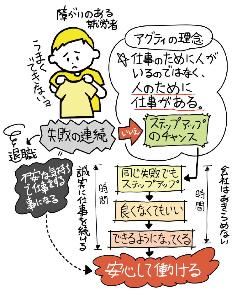 アグティが障がい者雇用に本格的に取り組みはじめたのは、先代の社長の時代、今から約二十年前のことだ。障がいのある方を採用するにあたり、社内で受け入れ研修を実施したが、すぐ退職する人が相次いだ。社員からも「同じ仕事をしているわけでもないのに、なぜ自分たちと同じ雇用条件なのか」という声が上がり、当時の社内は戸惑いに包まれた。齊藤さんはその経験を振り返り、「人は、頭で理解していても、受け入れられるとは限らない」と語る。